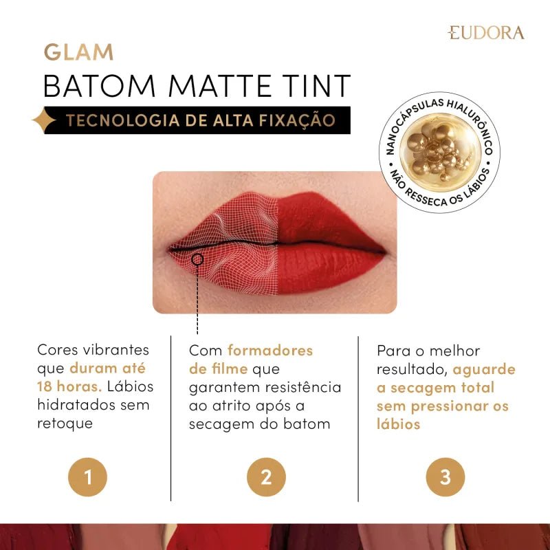 O batom líquido mais vendido de Eudora de cara nova com 18 horas de duração sem retoque e agora com ativos de tratamento! Sua fórmula com Nano Cápsulas Hialurônico não deixa os lábios ressecados, enquanto garante cor intensa logo na primeira aplicação, entrega um acabamento matte incrível em um nude clássico na cor marrom irresistível. Disponível em diversas cores , o Batom Líquido Nude Icônico é ideal para destacar ainda mais sua maquiagem, com embalagem nova permite que a cor seja visualizada mesmo antes de aberto, facilitando a escolha no dia a dia. Sem marcar os vincos dos lábios, sem transferir e nem borrar durante o uso, esse é o produto cheio de benefícios que não pode ficar de fora de seu nécessaire: 18h de duração sem retoques;ultrarresistente, não transfere e não borra; acabamento mate; altamente pigmentado; cor intensa, desde a primeira passada. Batom Líquido GLAM Matte Tint , o batom que não tem hora para sair! Nenhum produto Eudora é testado em animais, ou seja, este item possui selo Cruelty Free.