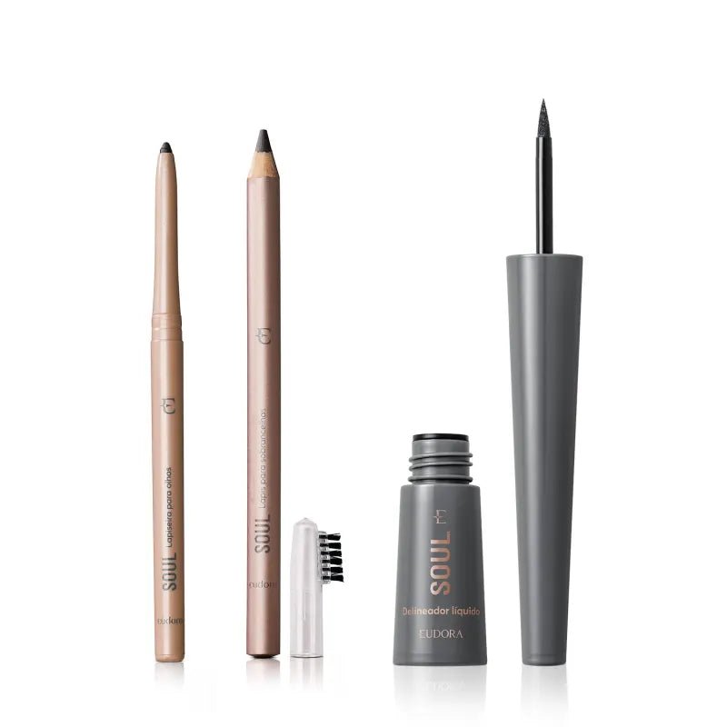 01 Delineador Líquido Para Olhos Soul Preto 2,5ml 01 Lapiseira Retrátil Para Olhos Soul Preto 3.5g 01 Lápis Para Sobrancelhas Soul Médio Escuro 1,1g